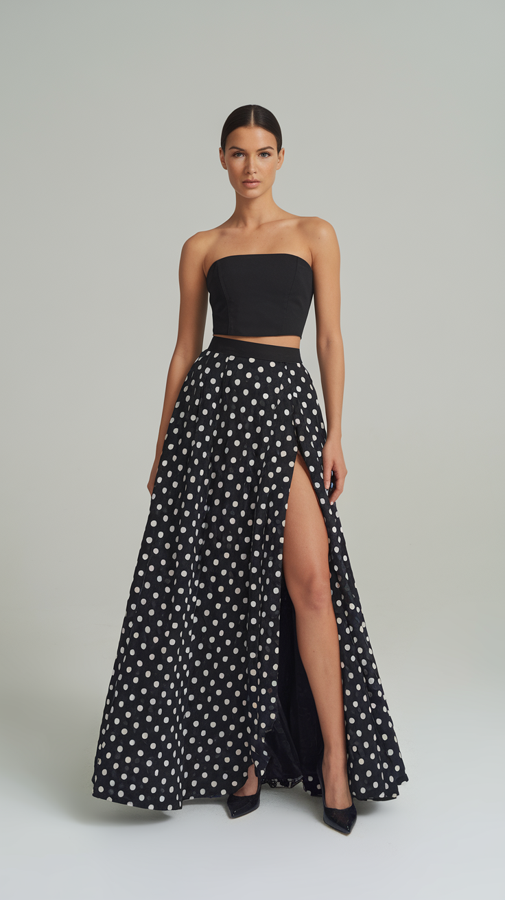 A strapless black crop top is paired with a high-waisted polka dot maxi skirt, featuring a bold thigh-high slit. This classic yet modern look is perfect for a senior picture or an elegant spring event.