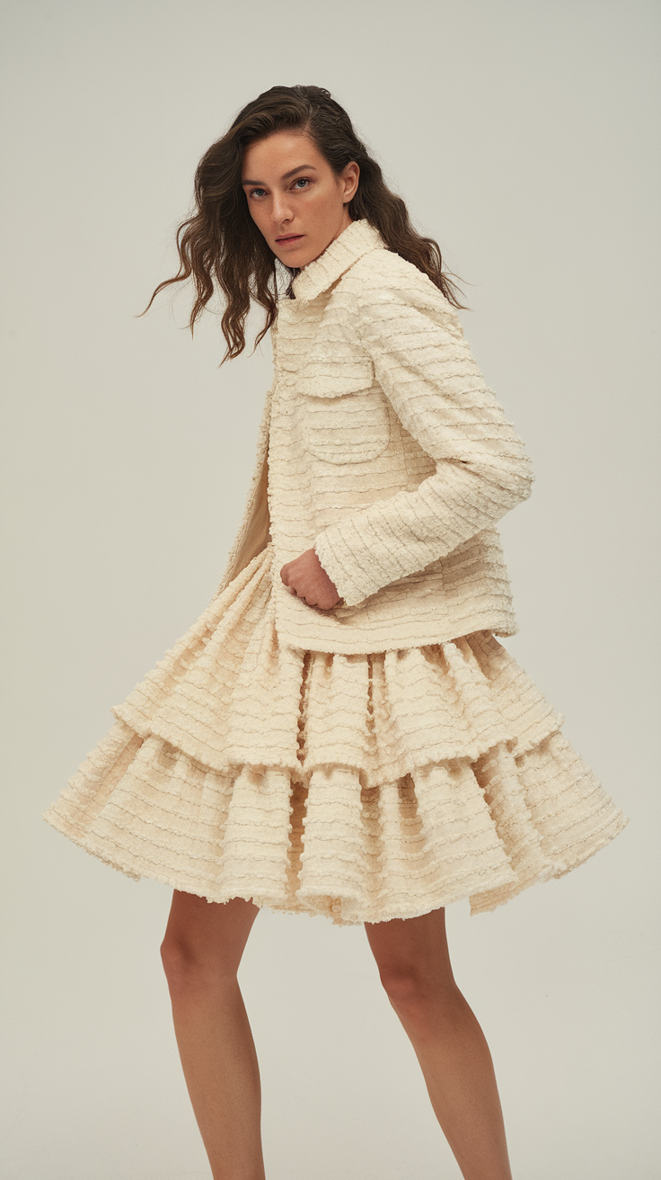 This monochromatic cream ensemble includes a textured jacket and a tiered skirt with delicate ruffled detailing. It’s an ideal outfit for Eid celebrations or chic winter trends.