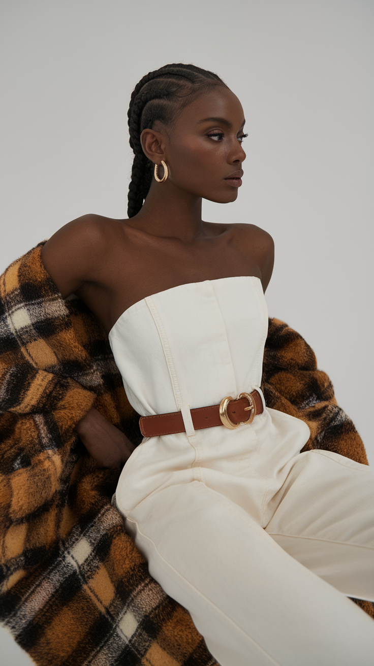 This chic look features a strapless cream jumpsuit, cinched at the waist with a brown belt featuring a gold buckle. Layered with a cozy plaid coat in earthy tones, it’s ideal for winter trends or a stylish Eid celebration.