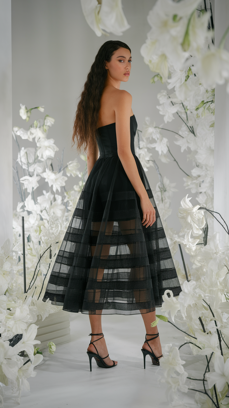 This elegant black dress combines a fitted strapless bodice with a full skirt featuring sheer striped panels. Styled with strappy black heels, it’s perfect for a graduation party or a sophisticated spring event.
