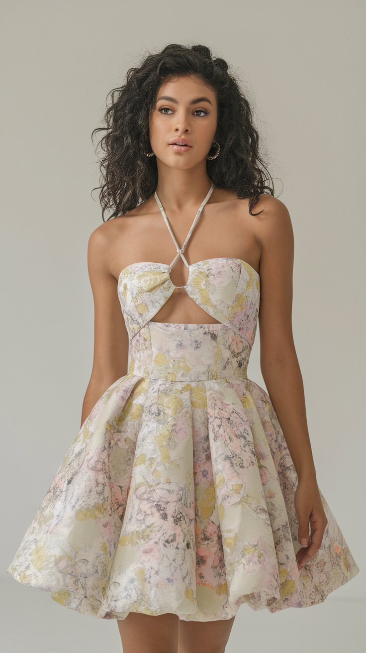 This pastel floral dress features a halter neckline with a delicate front cutout, paired with a voluminous pleated skirt. Its airy design makes it ideal for a summer event or a graduation ceremony.