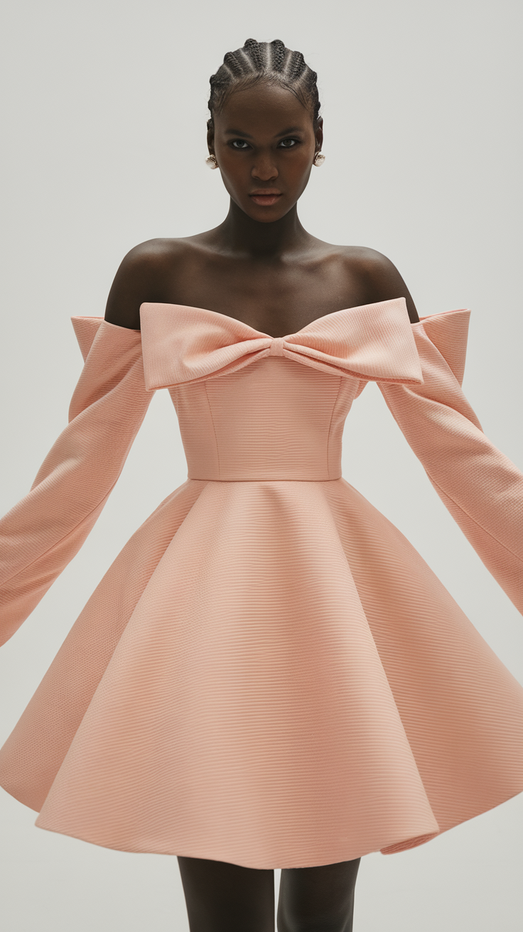 A structured peach off-shoulder dress is highlighted by an oversized bow on the bodice and flared sleeves. Its elegant silhouette is perfect for a winter gala or a New Year’s Eve celebration.