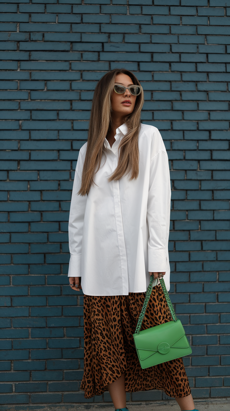 A crisp white shirt is styled with a flowing leopard-print skirt for a balanced and elegant look. Accented with a green handbag, it’s perfect for a Dua Lipa concert or casual year-end events.