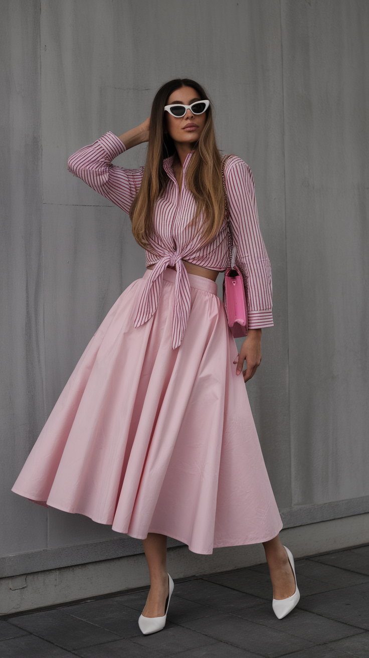 This look features a pink striped shirt knotted at the waist, paired with a voluminous light pink skirt. White pointed heels and a matching pink mini bag complete this elegant yet playful outfit, ideal for graduation events or a spring celebration.