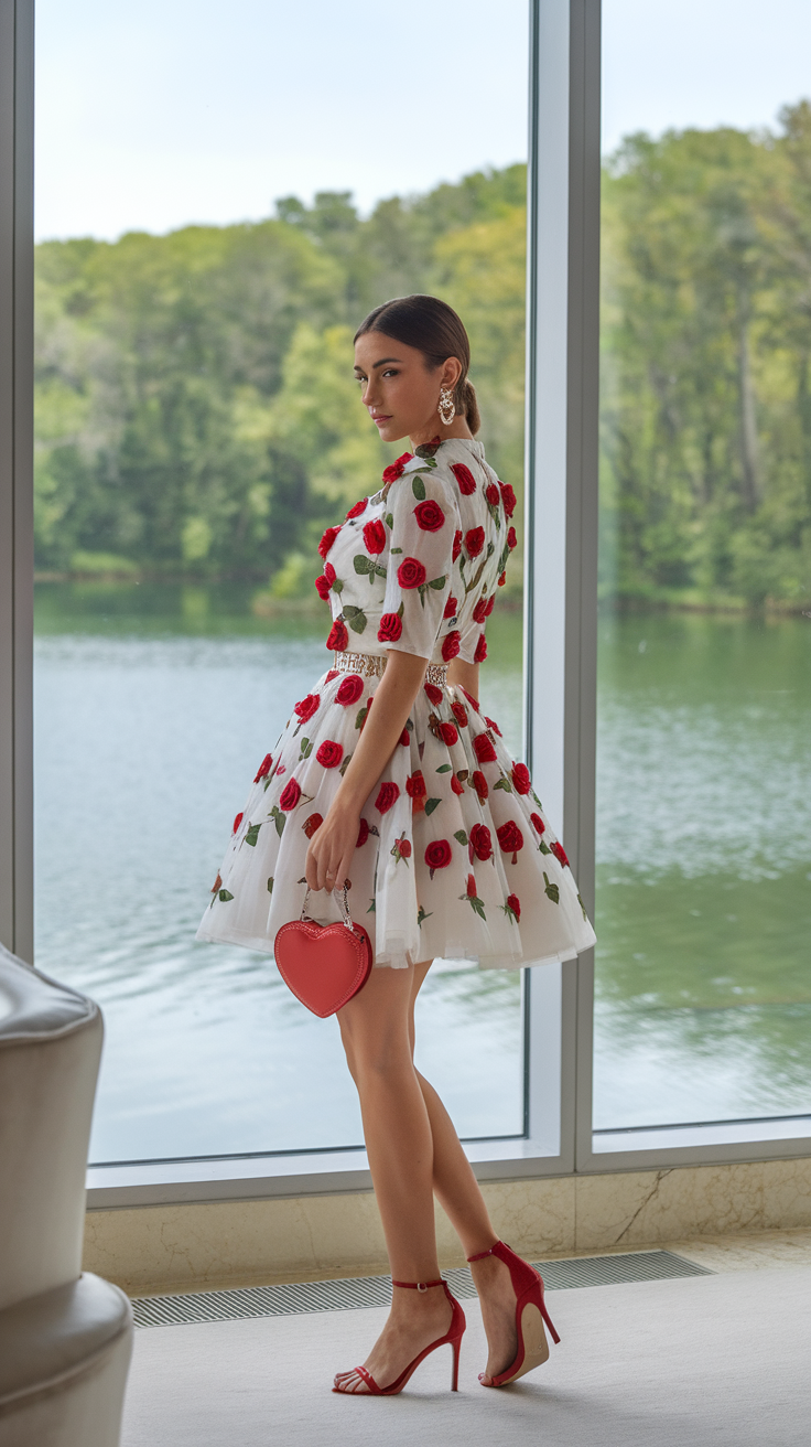 A delicate white tulle dress adorned with embroidered red roses creates a romantic and feminine look. Styled with red ankle-strap heels and a heart-shaped clutch, this outfit is perfect for Raya festivities or a Billie Eilish concert.