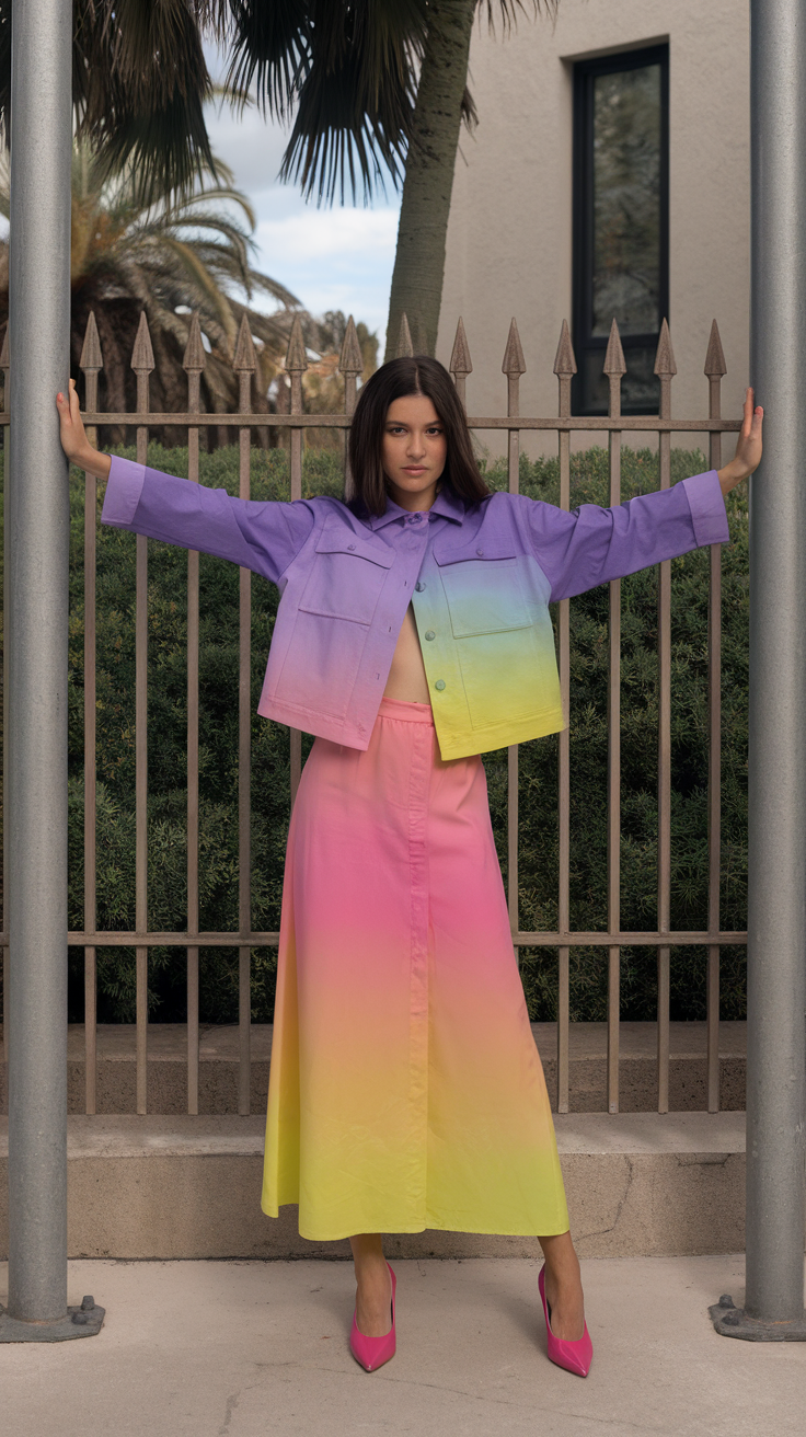 This outfit features a cropped ombre jacket transitioning from lavender to yellow, paired with a matching ombre maxi skirt. The look is completed with bright pink pointed heels, making it ideal for summer trends or a Katy Perry concert.