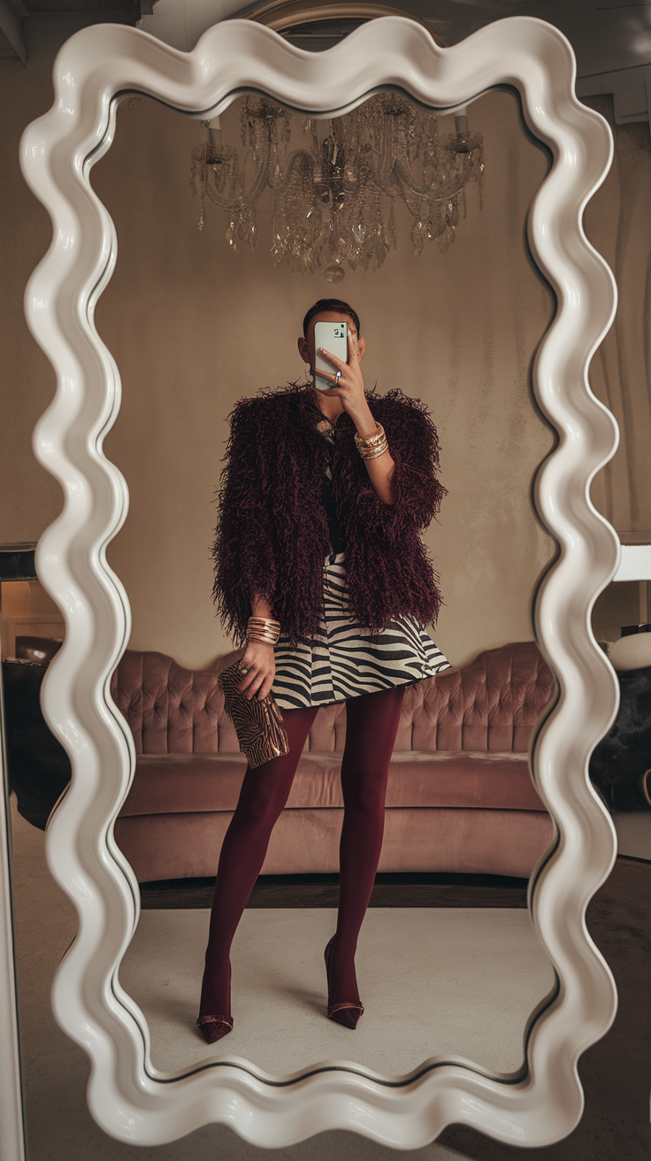 This bold ensemble combines a deep burgundy textured jacket with a statement zebra-print skirt. Burgundy tights and matching heels bring cohesion to the look, making it ideal for a Christmas celebration or a stylish year-end party.