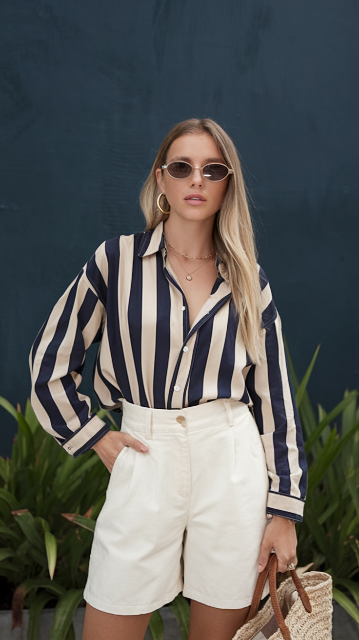 A relaxed, oversized cozy striped blouse with tailored white shorts gives a casual pulled together 2025 look. The deep navy stripes against the sharp white background will give you an essence of street style NewYork City so that it can make your summer outing chic. A sleek belt adds definition to the waist while sculptural bag smooths the obsessively elegant women’s casual pattern. This outfit is a perfect combination of comfortable and stylish, making it ideal for a beach stroll or an exquisite summer event.