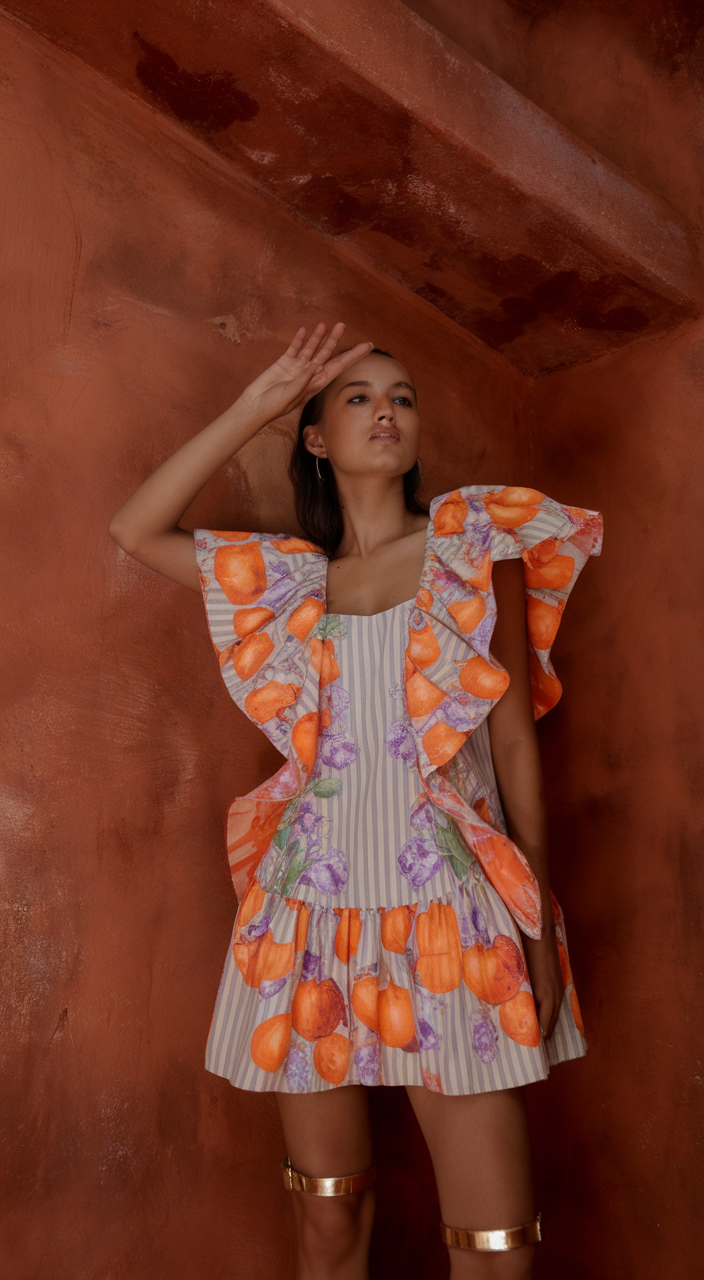 This bold dress is a fruity themed masterpiece for the year 2025 with exaggerated ruffled sleeves complimented by ginger fruit print. The fitted bodice is charming because of the mix orange and purple tones which damn add wonderful twist to the trending women’s casual styles. This statement proving birthday outfit when paired with minimalist jewelry becomes perfect for spring and summer fashion bursts.