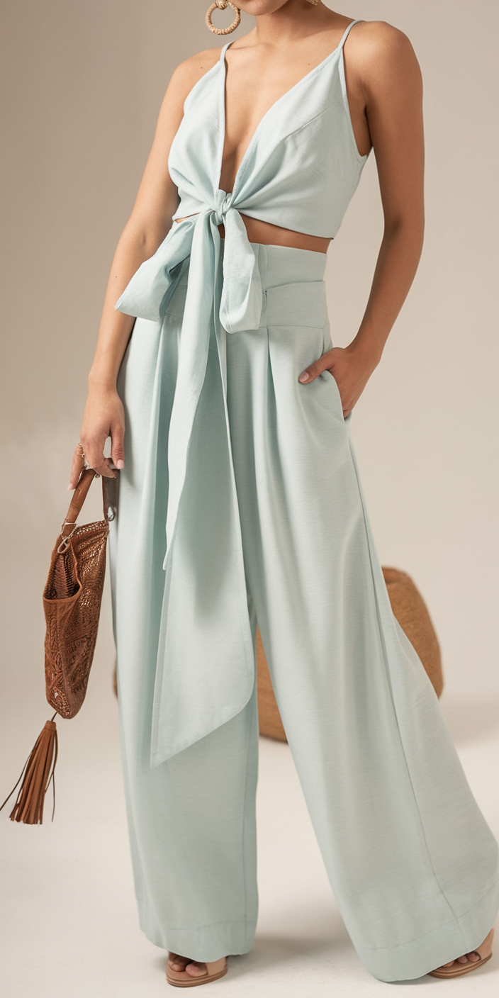 This soft pastel set is perfect for the summer season, as it combines class with comfort, making it an essential addition for 2025. The cropped top has an exaggerated deep V neck tie at the front which adds structure to it while, at the same time, feels relaxed. Flowing wide-leg trousers add to the outfit, aiming to achieve a simple yet attractive ensemble sprung from the warm weather. To finish off this effortless Women’s 2025 look, a woven handbag and jewelry pieces add the touch required.