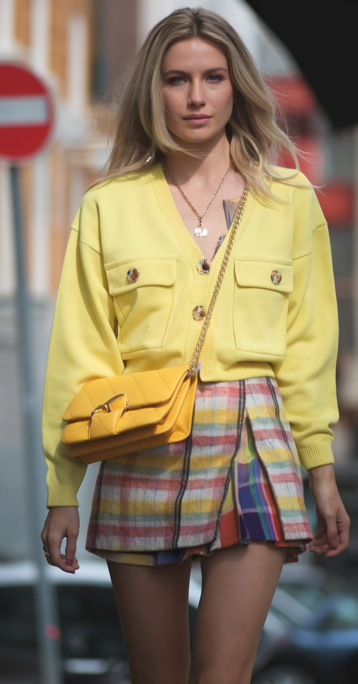 With casual streetwear, a striking yellow cardigan with an oversized button definitely offers an element fresh perspective. The style is elevated with the oversized multicolor plaid mini skirt and creates an ultra contemporary, youthful feel. This attention grabbing and bold New York City street style is completed perfectly by a quilted yellow handbag. For 2025, this fashion look is all about daring colors with fun combinations for a bold statement style.