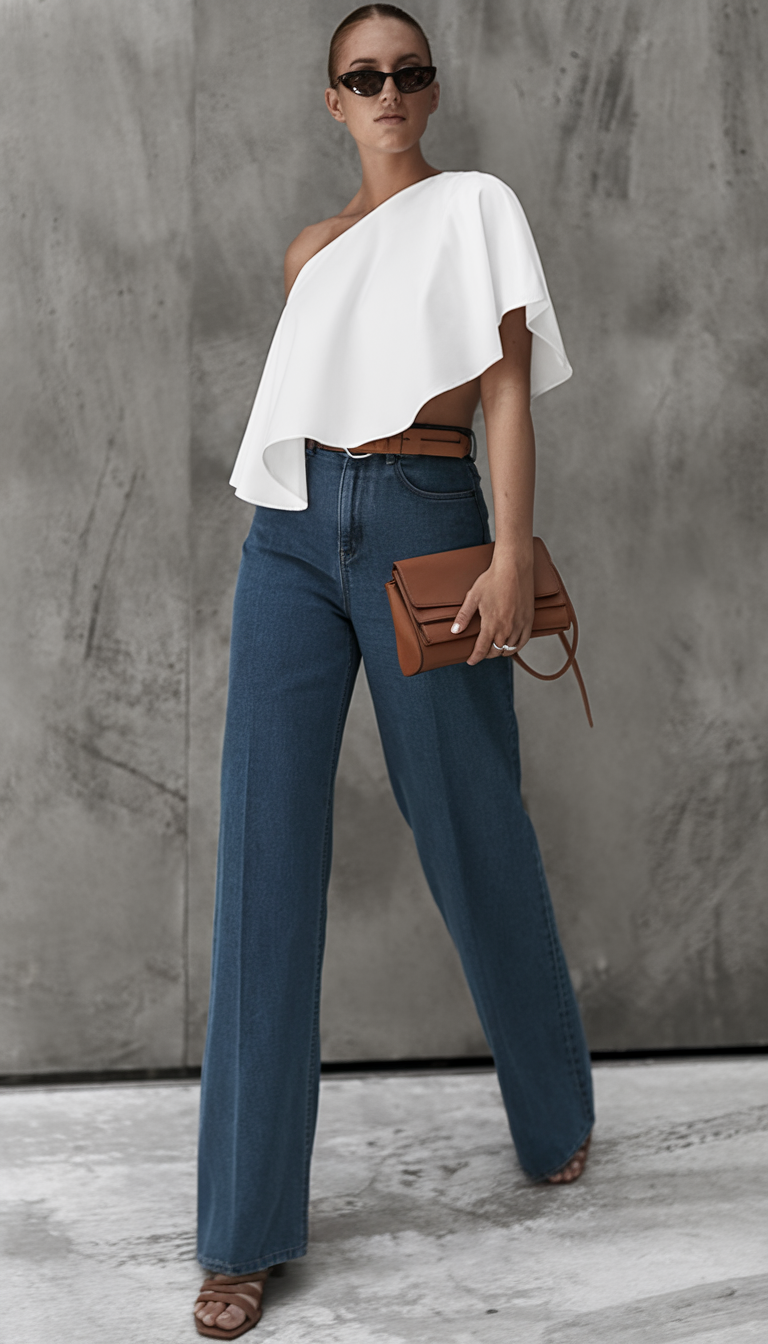 #12 Modern One Shoulder Blouse with Wide Leg Denim