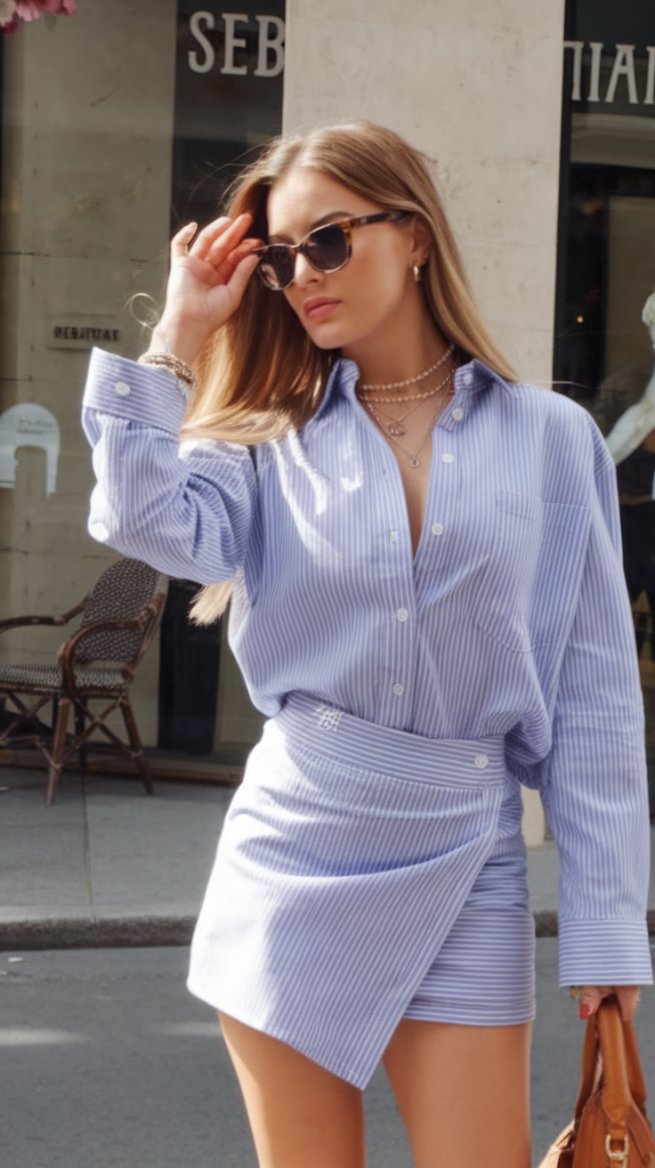 This set consists of a blue and white striped over-sized button-up shirt and an asymmetrical mini skirt. The semi-structured wrap skirt gives a clean cut edge which, when paired with the shirt, achieves a perfect portrayal of street style in New York City. Women 2025 seeking a sophisticated yet daring look definitely consider this outfit enhanced by layered pearl necklaces and tortoise shell glasses for the complete trendy look.