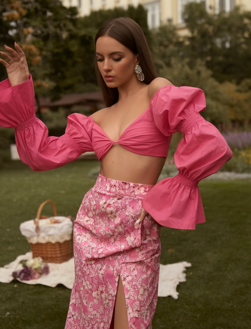 This trendy two piece set includes an voluminous off shoulder crop top with dramatic puff sleeves at the elbow. The skirt is a high waisted satin floral printed skirt with a flowing line and a thigh high slit. The combination of structured sleeves with soft fabric gives this 2025 attire the shoulder and bust balance which is perfect for summer events.