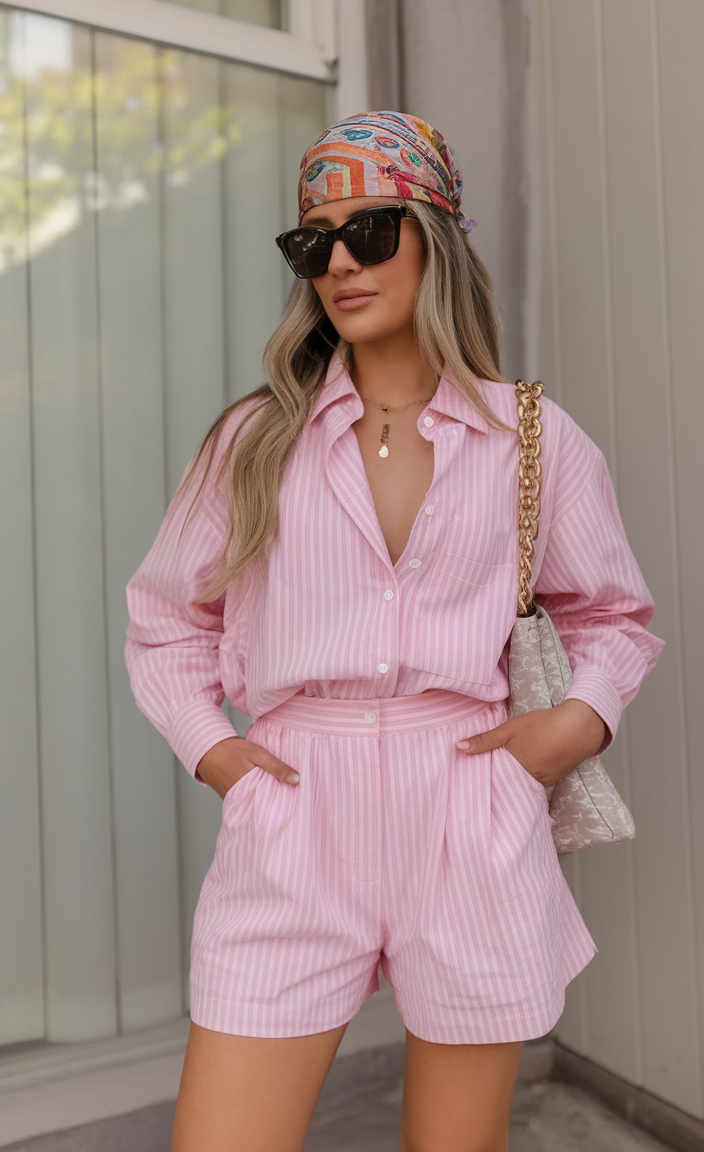 This women casual outfit features a quite simple yet sophisticated soft striped pink oversized buttoned dolly shirt with matching high waist shorts. The fabric is quite light so it can be worn in the spring or summer months. The printed headscarf and gold chain bag achieve the perfect blend of boho chic styles for casual dress days that require a bit of polish.