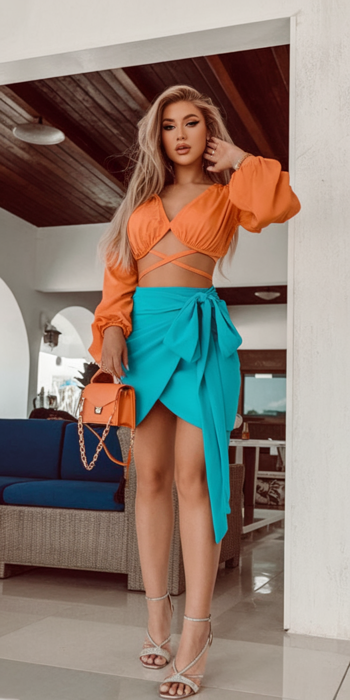 The vibrant pair of a wrap skirt and light top in bright colors is an emerging fashion look for 2025. The outlandish colors provide energy, and the skirts’ light flowing fabric provides for comfortable movements. This ensemble is optimal for casual wear in the warm weather or for strolls during the summer.