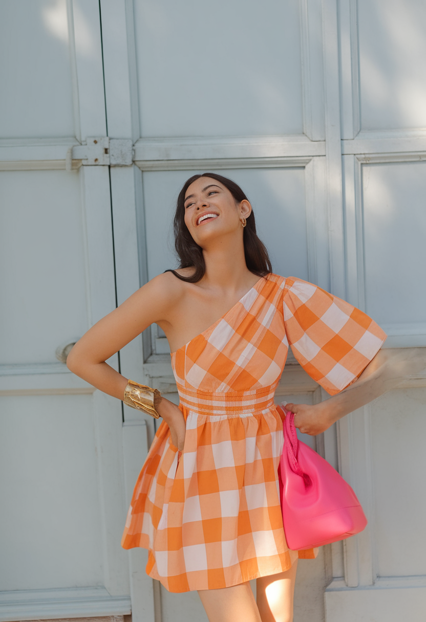 The warm orange and white gingham print on this dress exudes a youthful vibe. The beach-ready asymmetric neckline comes to life with a single voluminous sleeved, which makes it look extra dramatic. A dramatic pink handbag and a fitted waistband adds more appeal along with contrasrting silhouette. This casual feminine outfit is suitable for summer daytime functions or birthday parties.