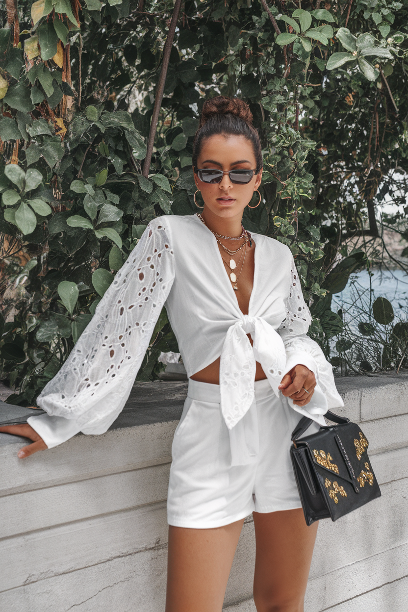 This monochrome summer outfit features feminine embroidery alongside a tailored structure which creates a breezy summer look for 2025. The long-sleeve blouse has eyelet cutouts along the sleeves, and the front is tied to give the blouse a feminine feel with the high waisted shorts. The outfit can be worn for a casual break visit at the beach or a semi-formal day occasion paired with gold jewelry and a black structured handbag for a casual womens outfit.
