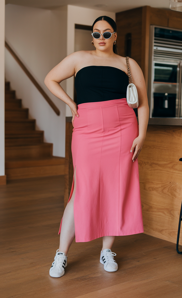Look classy while having fun in the sun with this elegant comaprison of a black tube top and a pink midi skirt. The skirt is designed with a structured fit giving it class, while a side slit adds delicacy and movement. Paired with a shoulder bag and white sneakers, the outfit is a simple fusion of modern street styles and contemporary party wear. The black and pink colors contrast brilliantly, making it suitable for trendy concerts or state fairs.