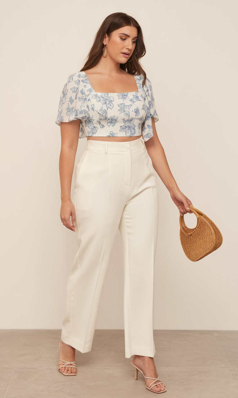 This elegant summer outfit features a floral crop top by Shein with flutter sleeves and stylish high-waisted white trousers. Paired with a structured pant, this look is perfect for a university event or a concert because of its sleek silhouette. This outfit is simplified casual street styles that is versatile enough to be worn on a night out or a stylish brunch. The woven handbag elevates the look by adding coffee colored natural texture to the modest yet trendy outfit.