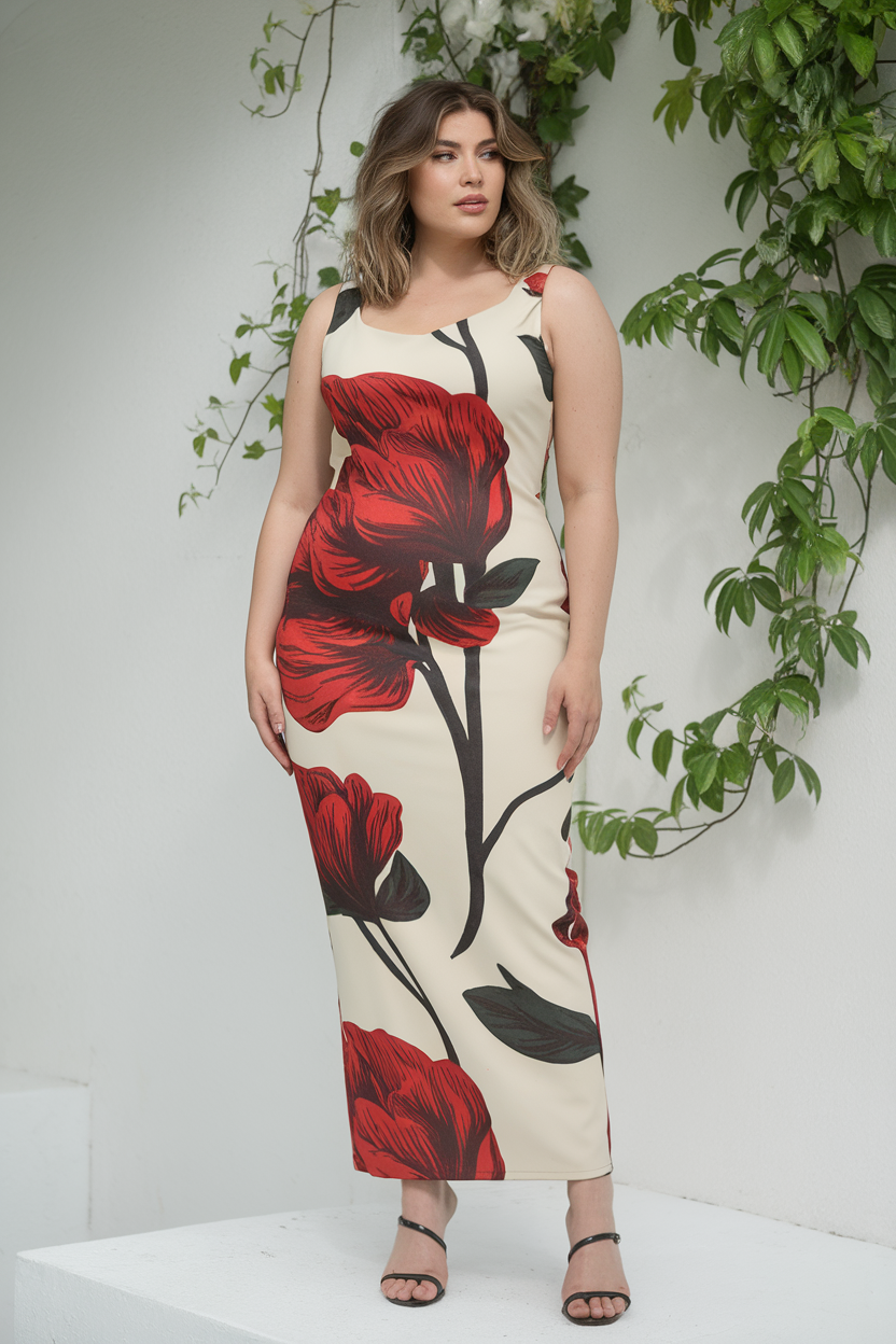 Beautiful sleeveless maxi dress that has a neutral base and large, bright red florals over it. It has a fitted shape which is great for the figure, making it a perfect choice for a garden event or concert in London. Ilst paired it with some simple black pumps, and I must say, the outfit was beautifully marredord and modern at the same time. The dress is great for a summer dinner or an evening stat fair visit.