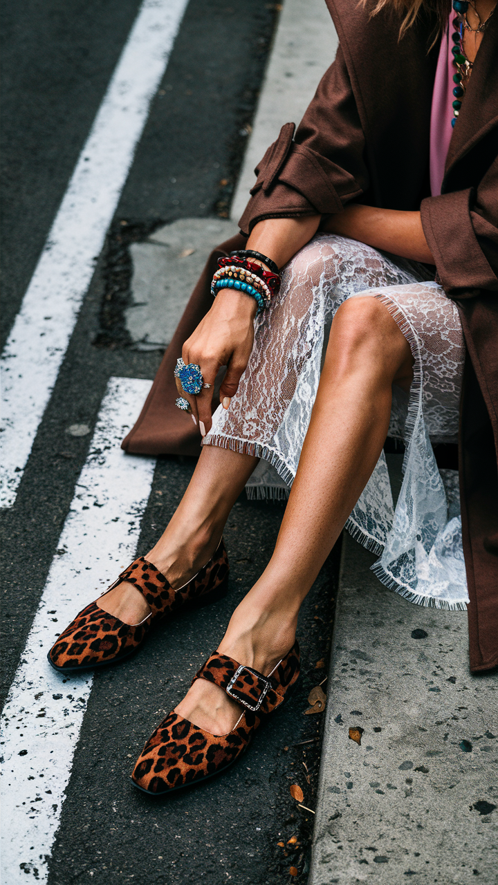 This outfit highlights a delicate white lace midi dress styled with bold leopard print flats, bringing an edge to the feminine look. The pointed-toe shoes with buckle detailing enhance the modern, eclectic vibe. Paired with layered accessories, this ensemble seamlessly blends vintage elegance with contemporary flair.