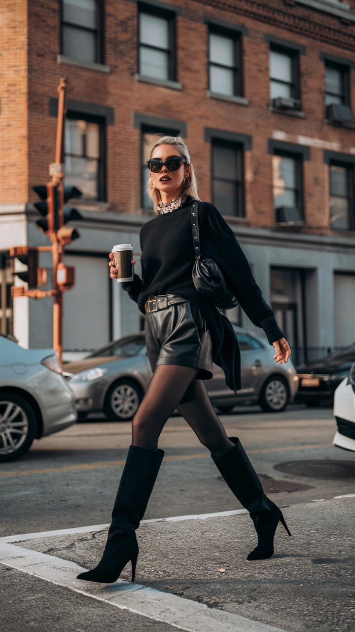 This outfit features a cozy black knit sweater paired with chic black leather shorts, creating a sleek monochrome look. Sheer black tights and pointed-toe knee-high boots add a sophisticated edge to the ensemble. The bold use of textures ensures a stylish yet practical outfit for cooler days.