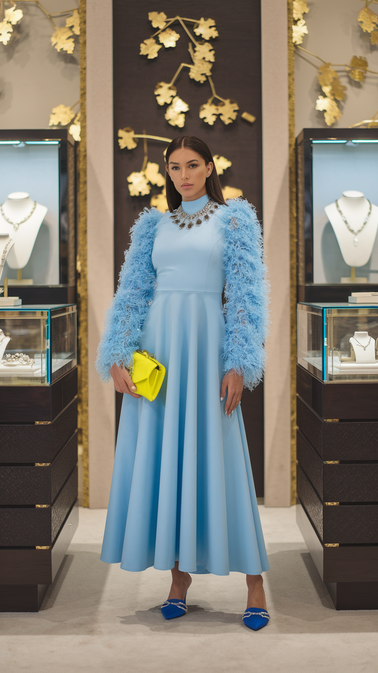 A stunning powder blue midi dress takes center stage with its statement feathered sleeves adding texture and drama. The look is complemented by blue pointed-toe heels adorned with sparkling embellishments for a glamorous finish. A vibrant yellow clutch provides a striking pop of color, balancing elegance with boldness.