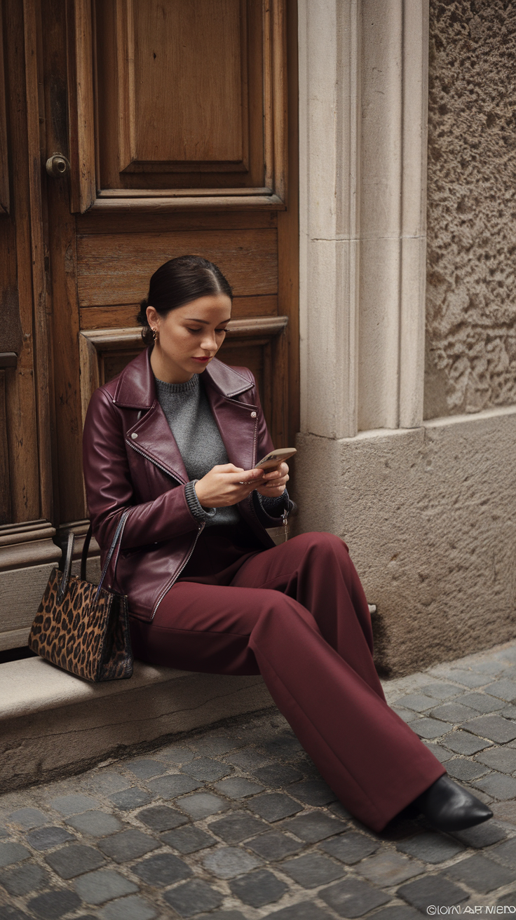This outfit pairs a sleek wine red leather jacket with tailored wine red trousers, creating a bold and coordinated look. A grey knit sweater adds softness and texture to the ensemble, balancing the rich hues. The leopard-print tote completes the outfit with a stylish pattern accent.