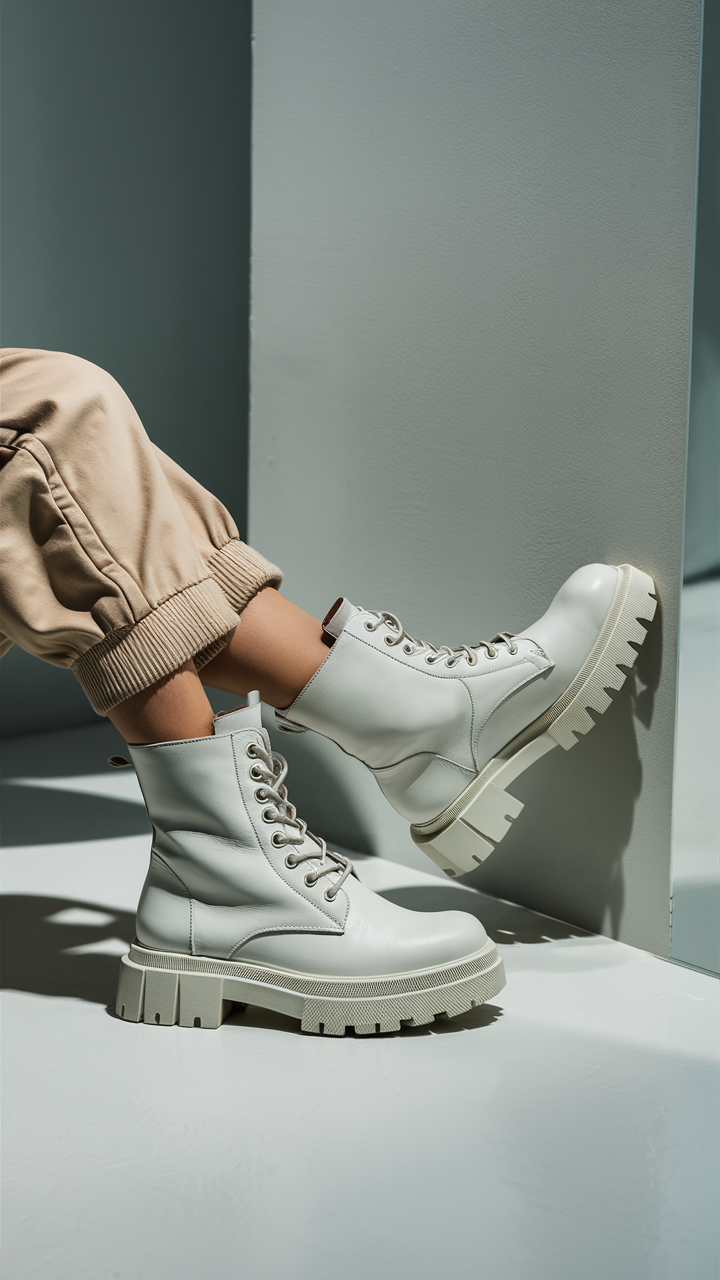 This casual look showcases white chunky combat boots paired with relaxed beige joggers, emphasizing comfort and functionality. The high-ankle design and thick soles of the boots add a trendy, edgy vibe. Perfect for streetwear-inspired outfits, this combination balances casual and chic.