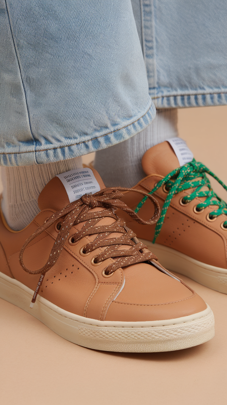 This close-up features tan leather sneakers enhanced with contrasting glitter laces in green and brown. Styled with light-wash denim jeans, the sneakers stand out as a casual yet eye-catching footwear choice. The combination is perfect for adding subtle sparkle to an everyday outfit.