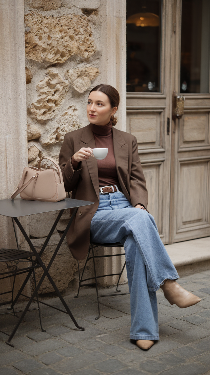 This look features a structured brown blazer styled with light-wash straight-leg denim jeans for a casual yet polished vibe. A dark brown turtleneck adds warmth, while nude pointed-toe shoes and a matching beige handbag bring a cohesive neutral palette. This outfit is perfect for an effortless café style.