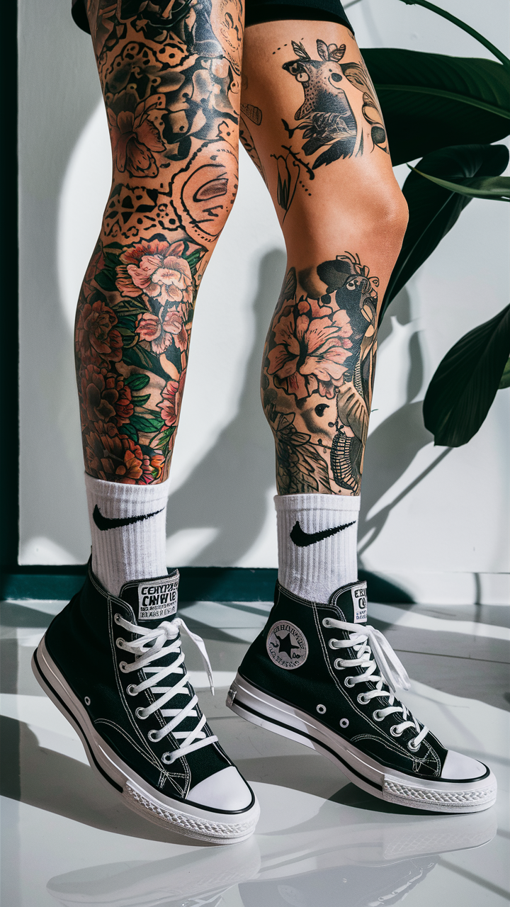 This outfit showcases classic black Converse high-top sneakers paired with white sports crew socks, creating a laid-back and edgy look. The shoes’ timeless silhouette adds a retro touch, making them versatile for any casual outfit. This footwear choice is ideal for adding attitude to a streetwear ensemble.