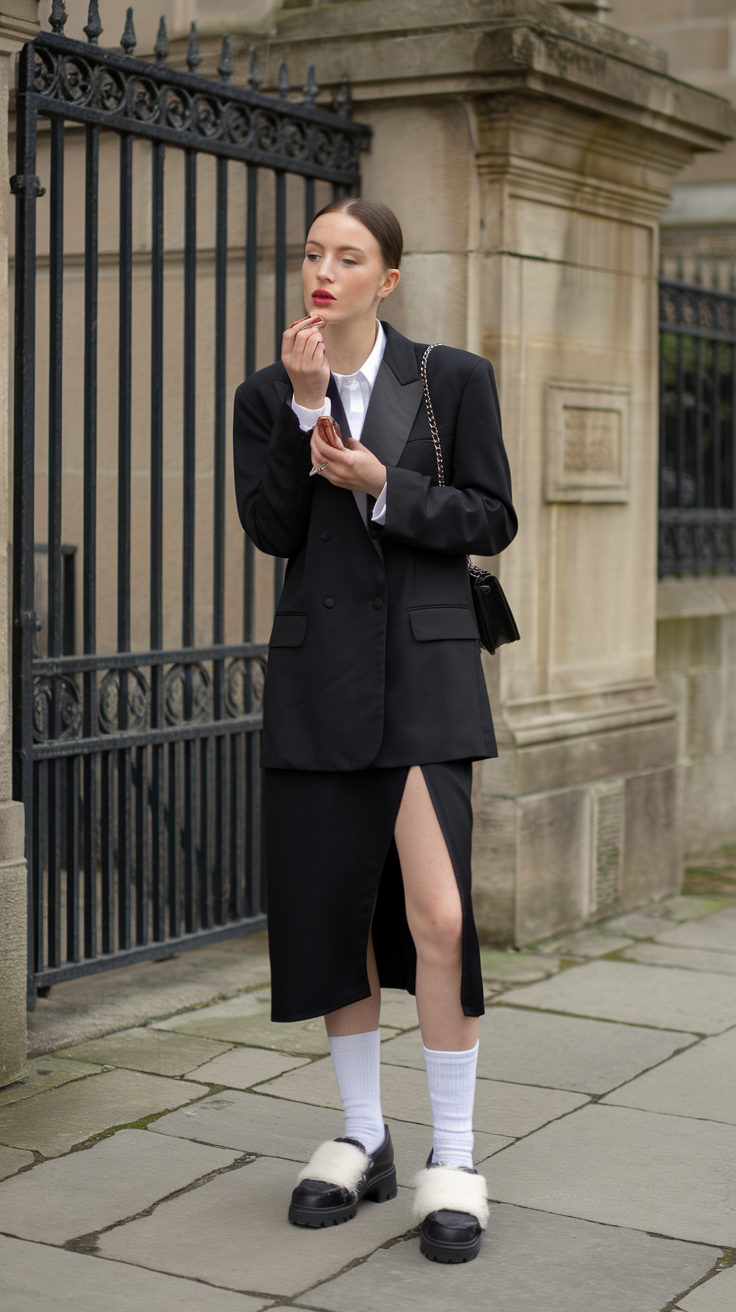 A sharp black tailored blazer is paired with a high-slit black skirt, creating a sophisticated monochrome look. The standout element is the chunky black loafers adorned with fluffy white accents, adding texture and playfulness. The outfit’s balance between structure and softness makes it uniquely stylish and modern.