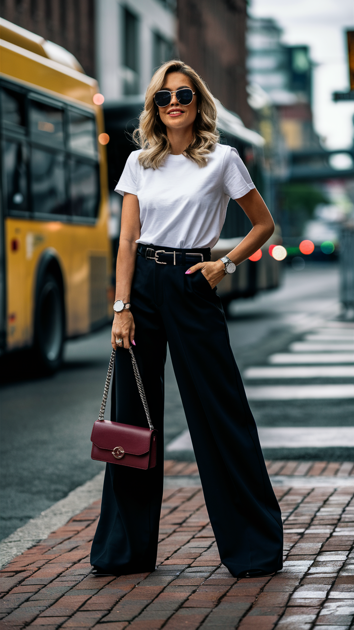 This outfit pairs a classic white t-shirt with tailored black wide-leg trousers, creating a polished and timeless look. A sleek black belt with a silver buckle cinches the waist, adding a structured touch. The ensemble is elevated by a wine red crossbody bag with a chain strap, adding a sophisticated pop of color.