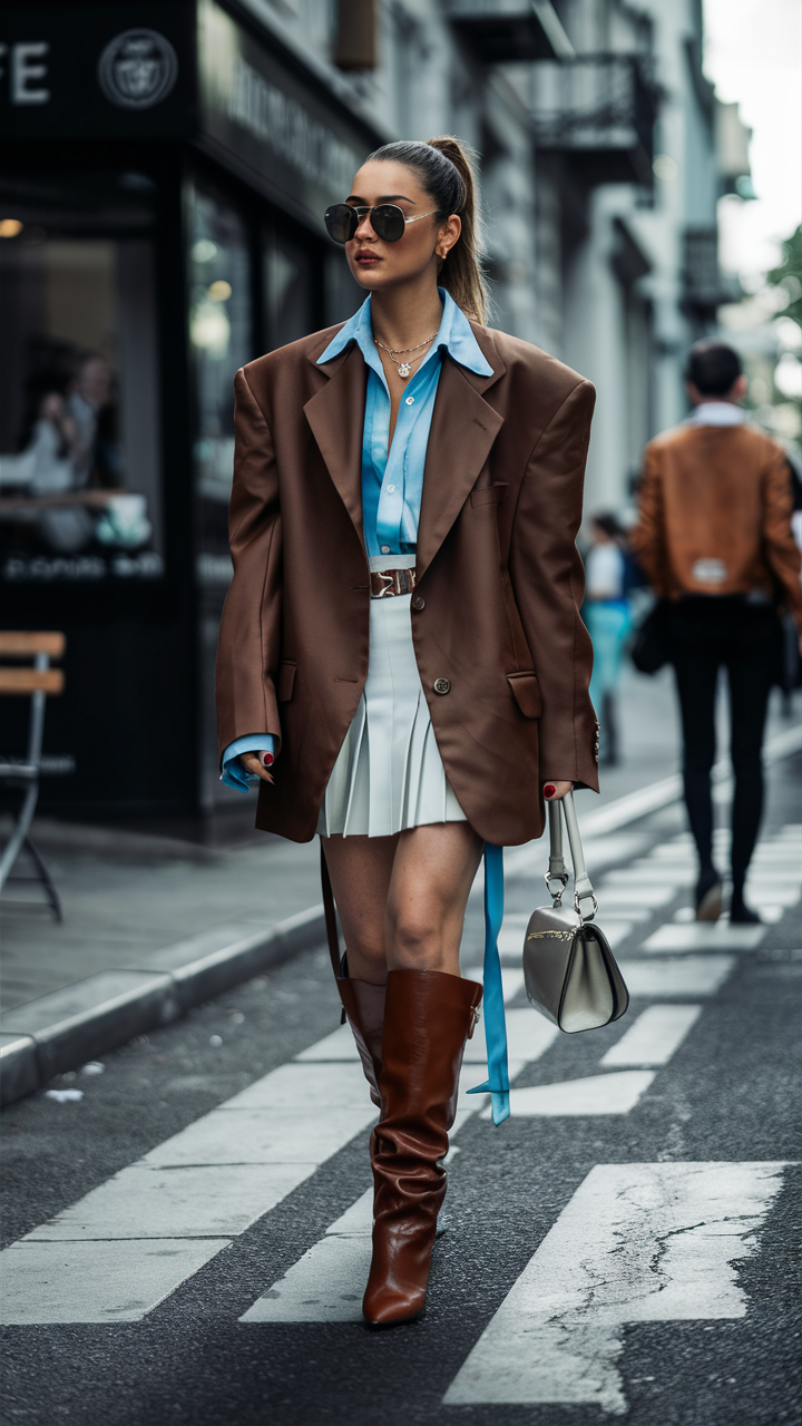 An oversized brown blazer paired with a pleated white skirt creates a chic, structured silhouette. The standout element is the cherry red boots, which bring a bold contrast to the outfit. Their high-cut design makes them a trendy yet timeless addition to this street-style ensemble.