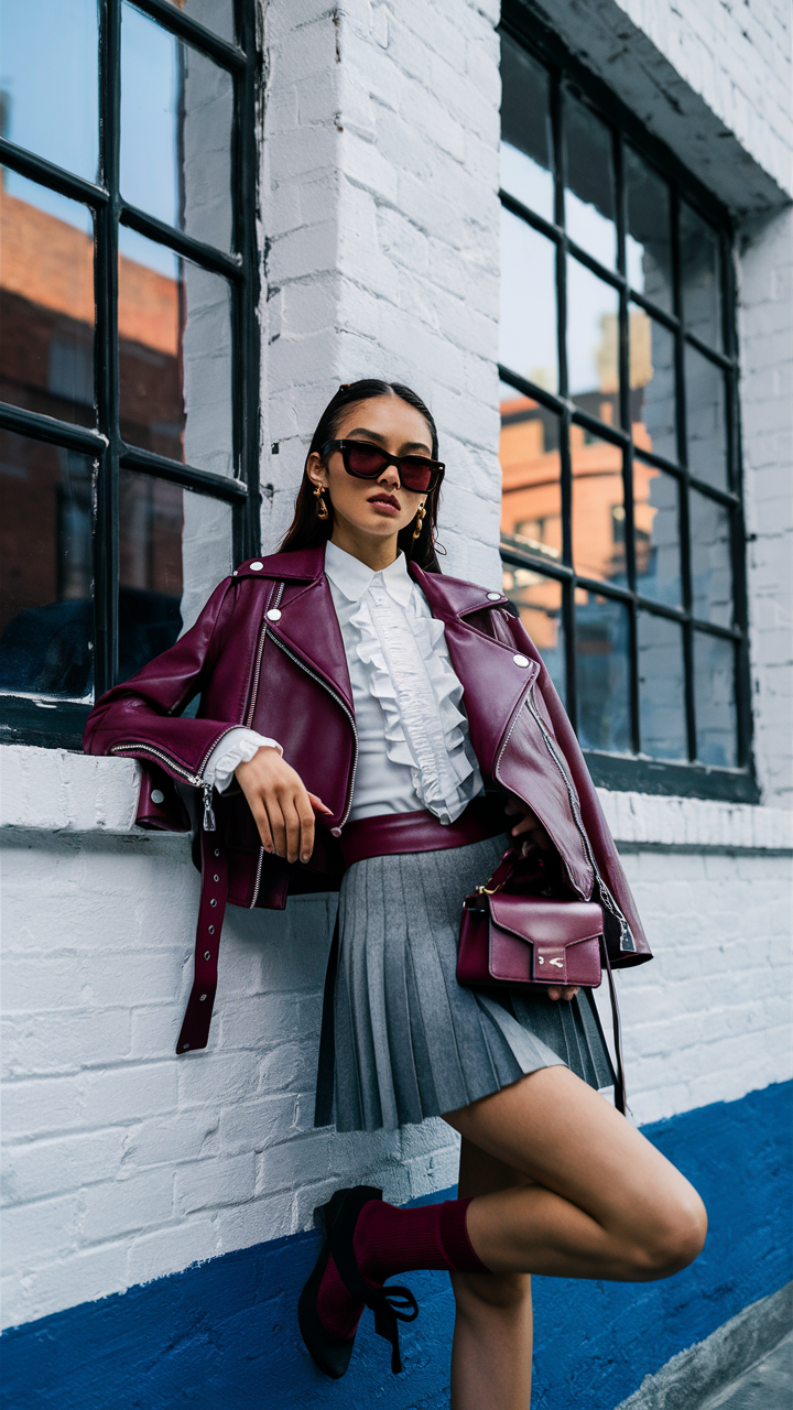 This outfit features a wine red leather jacket with bold metallic accents paired with a grey pleated skirt for a balanced mix of edgy and preppy styles. A crisp white blouse with ruffled detailing adds an element of elegance to the look. The deep red socks and black doll shoes complete the ensemble with a playful yet refined touch.