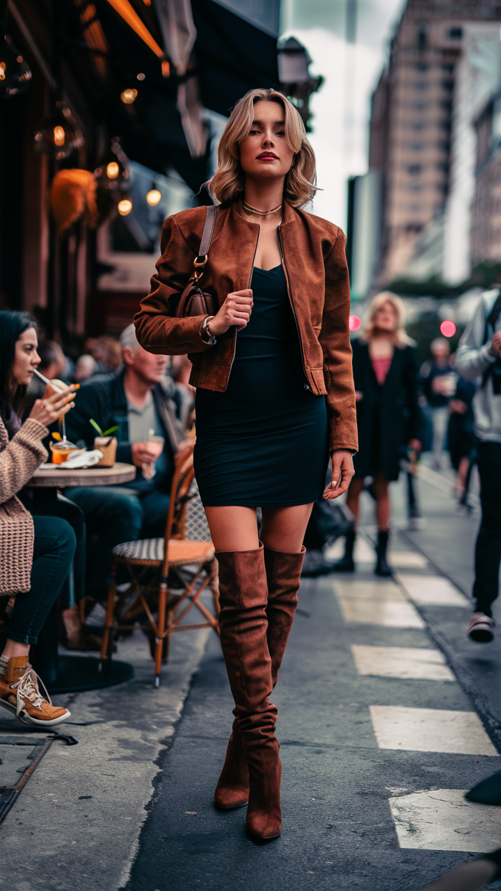 This outfit features a sleek black bodycon mini dress paired with a brown suede jacket, adding warmth and texture. Complementing the look are knee-high boots in matching brown suede, offering a cohesive and stylish finish. This ensemble is perfect for a chic and casual evening out.