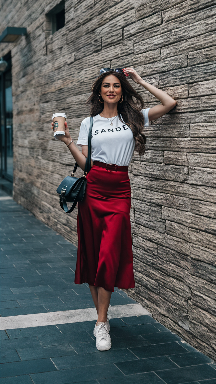 A minimalist white graphic tee is tucked into a vibrant cherry red satin skirt, creating a balanced mix of casual and statement elements. The outfit is completed with white flat sneakers, providing comfort and versatility. This stylish yet practical look is ideal for daytime activities or relaxed outings.