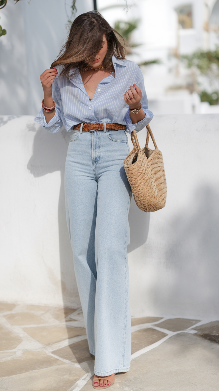 This casual women’s summer look combines a blue vertically striped oversized button-up shirt and high-waisted, wide-legged casual jeans. The shirt is effortlessly tucked in and held in place by a woven brown belt, giving a natural accent to the outfit. Because this outfit is modest and comfy, it can easily be turned into a back to school requires look, or kept for a more relaxed day at work. Pair the outfit with a straw bag and add a bit of coastal aesthetic charm to your wardrobe.