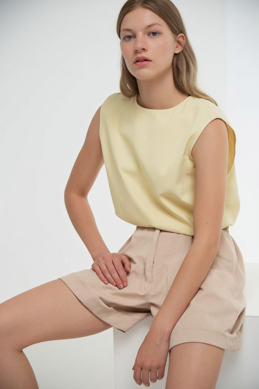 An effortless sleeveless pale yellow top is tucked into casual high-rise beige rolled hem shorts making this outfit easy to breath in the warm weather. The subtle colors paired with the soft and flowy fabric creates a youthful and fresh vibe which is great for hot summer days. This outfit is perfect for busy days out or relaxing at home as it’s very comfortable. It’s a natural choice for women’s minimalist summer wardrobes in 2025 seeking fashion inspiration.