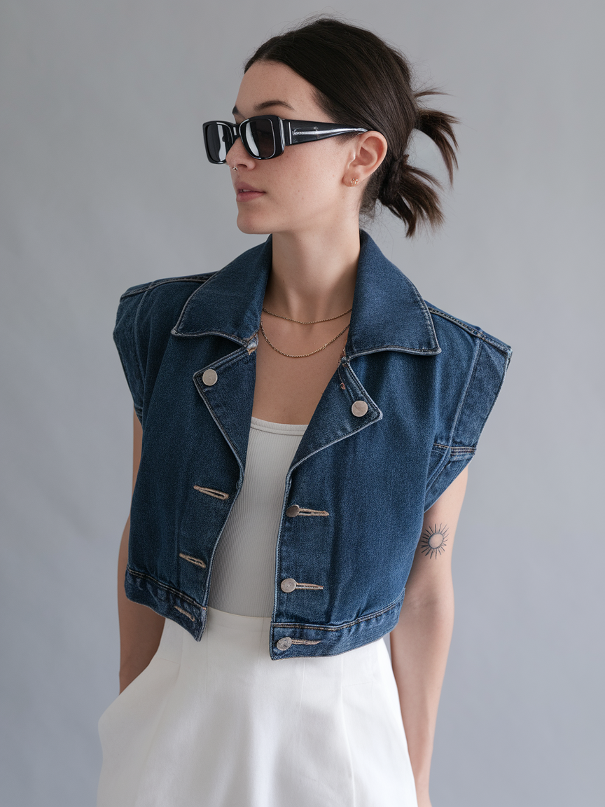 The outfit revolves around the stunning contrast of a dark-wash cropped denim vest accentuated over a ribbed white tank and high waisted white bottoms. The sleeveless denim jacket serves as a structured overlay to an otherwise overly simplistic summer outfit inspo 2025. This is a great solution of women casual wear that mixes cool tones with a boastful body shape, great for layering during those late summer days.