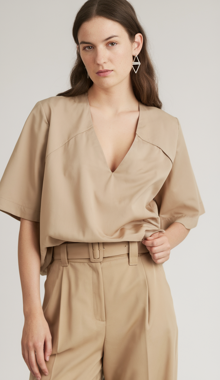 This toned set comprises a light tan V-necked blouse which is quite loose in fit with a pair of high waisted trousers that are tied at the waist with a wide belt of the same color as the blouse. The clean lines with soft tailoring give it a minimal profile yet it looks very sophisticated. It is a refined work outfit that provides comfort and versatility throughout the long day. This is perfect for modern women who wish to maintain a clean but understated look.
