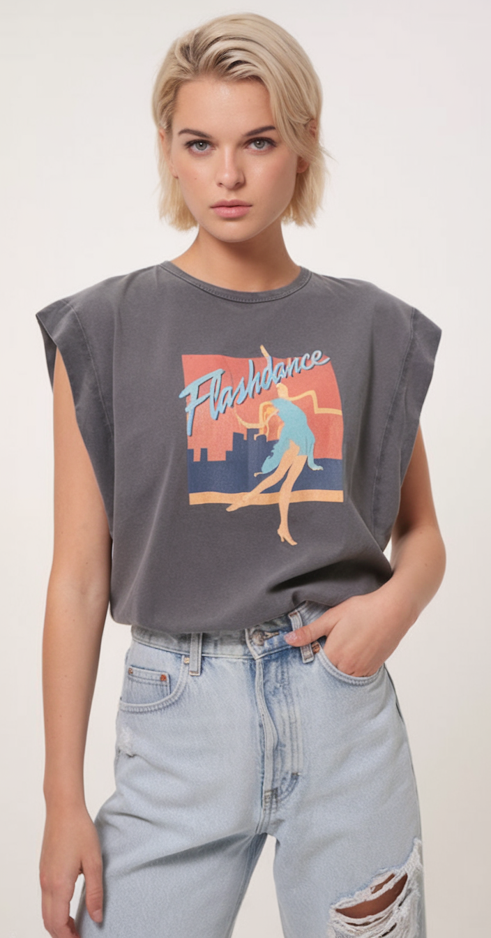 The ensemble contains a light gray Flashdance graphic tee with dropped shoulders featuring a boxy crop. It’s styled with ripped, light-wash casual jeans which add a retro inspired edge. It could be the perfect outfit of the day for teens and women aiming for a bold summer aesthetic. The soft versatile fabric and the unique silhouette make this piece stand out for effortless summer outfit inspiration in 2025.