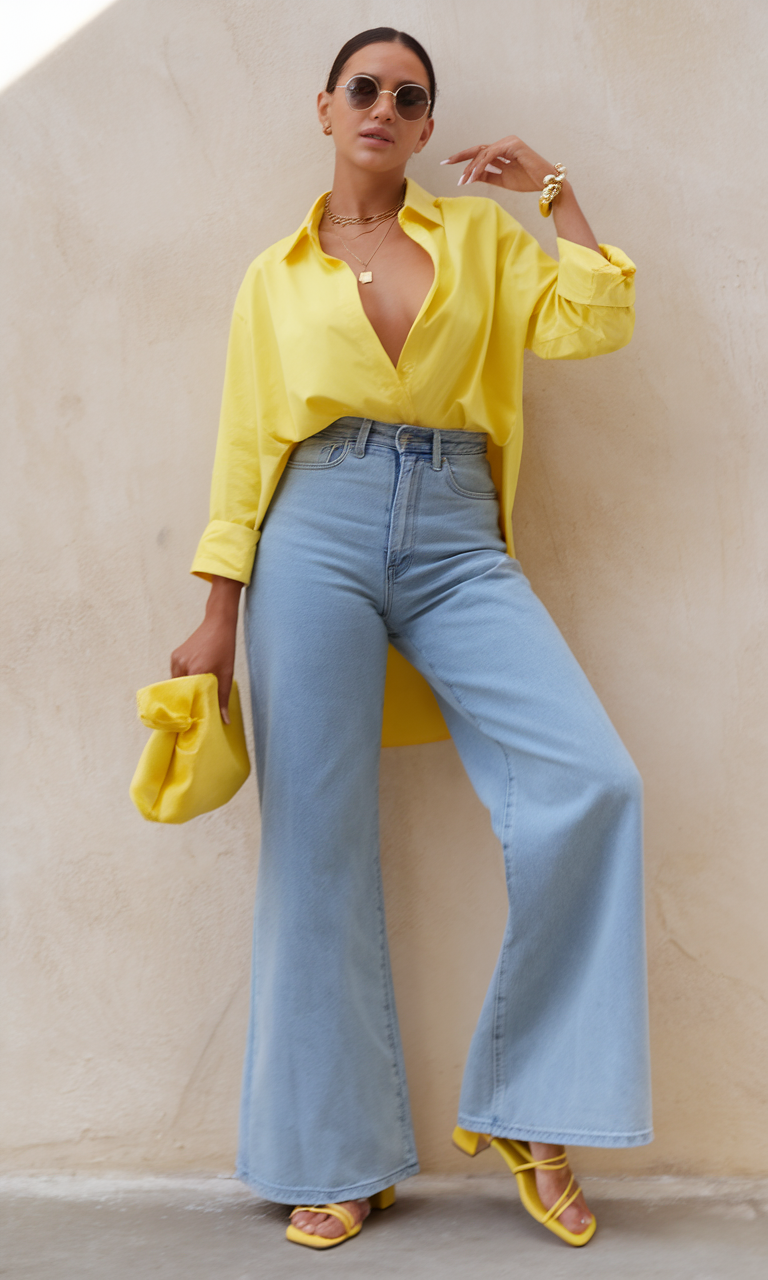 #5 Big Yellow Shirt along with High-Waisted Wide-Leg Jeans