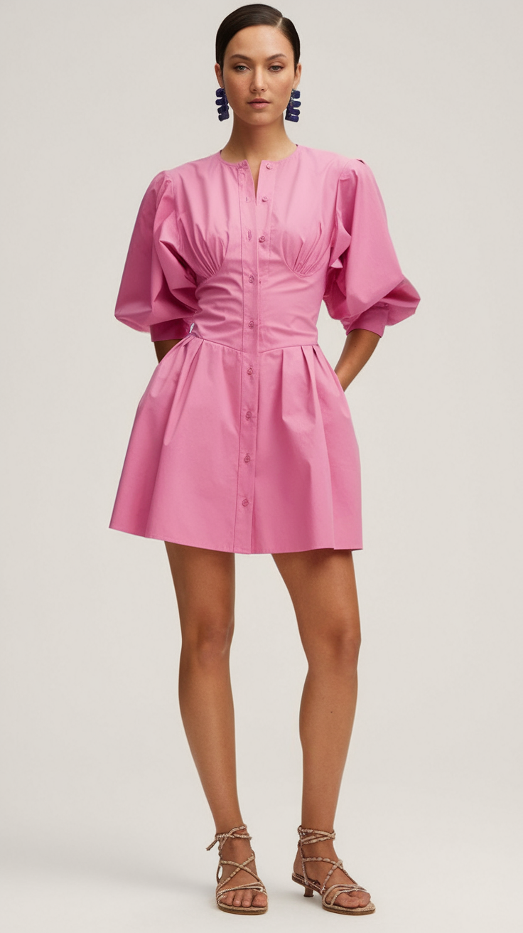 The voluminous bubble sleeves and defined waist highlighting the shirt dress pink provide suffucient detailing at the front with buttons. It is a opt pleece for styling in summer head broader shoulders. Pink tonal hues shifts from stern to offer a cute pop of color while the twithed fit gives a tailored dress. It’s a standout choice for modest outfits that are still modern for females and teenage girls attending school. A striking suggestion for 2025’s summer outfit inspirations where sophisticaton meets ladish chic.