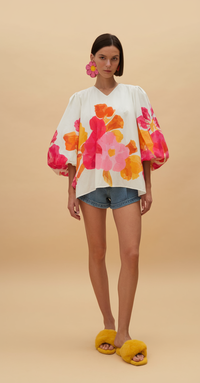 This look showcases a puffed white blouse with oversized balloon sleeves and orange and pink floral print. The top is a statement piece and the fitted dark-wash denim shorts create balance. This aesthetic is ideal for women who enjoy comfy artistic pieces. This is a perfect choice for skirts or casual weekend strolls.