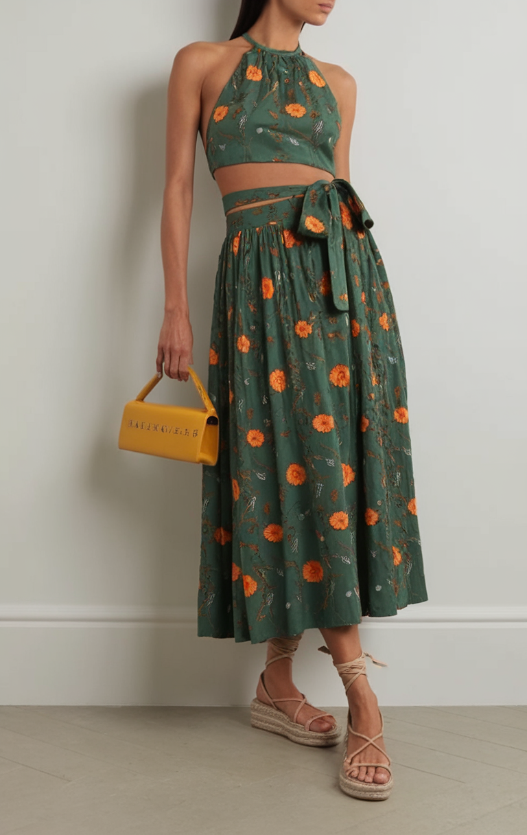 The set consists of two pieces which includes a feminine high waisted skirt along with a crop halter top. Both the skirt and the top are embroidered with bright orange flowers on a deep green base. The waistband of the skirt is wide with a cute bow tie on the side. This Aesthetic attire is great for a casual summer gatherings or weekend outings during the warmer months. For summer outfit inspo 2025, this set is flirty without being overboard, making this set very easy to style.