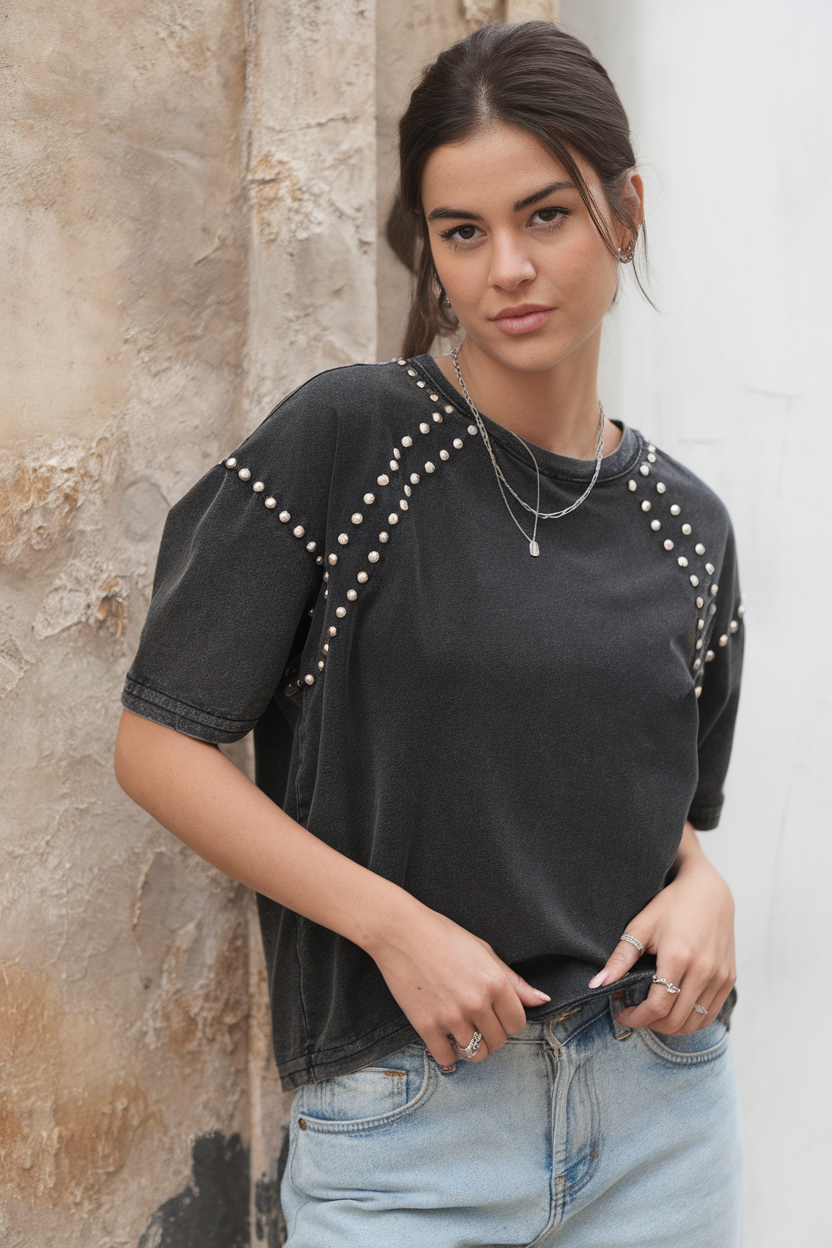 #17 Black Studded Tee with Washed Blue Denim Shorts