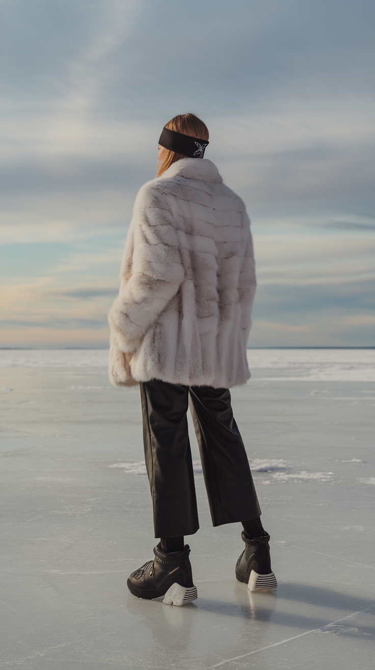 A luxurious white fur coat offers warmth and elegance, paired with sleek black leather pants for a sophisticated touch. The addition of black chunky boots adds a modern and edgy vibe to the outfit. A simple black headband completes this effortlessly chic winter look.